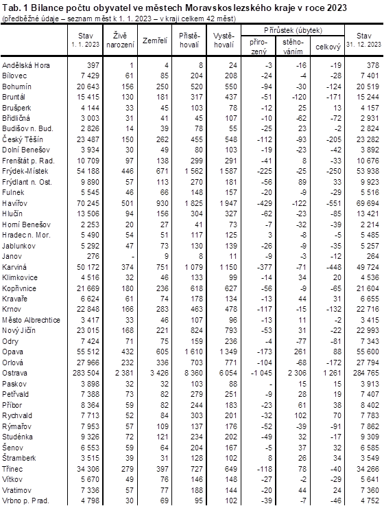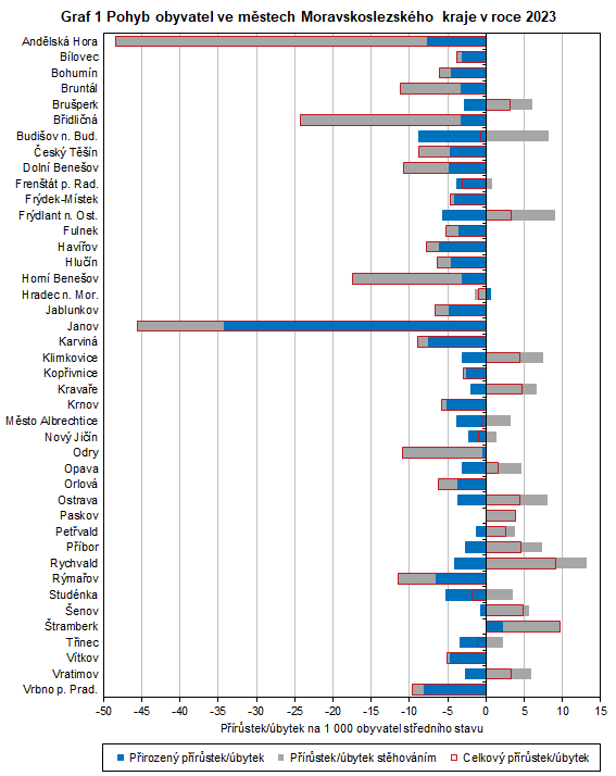 Celkový počet obyvatel žijících ve městech v Moravskoslezském kraji se během roku 2023 snížil výhradně kvůli vysokému přirozenému úbytku (–3 557 osob), neboť stěhováním obyvatel bylo dosaženo kladných hodnot (2 388 osob).