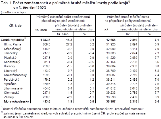 Subjekty se sídlem v Moravskoslezském kraji zaměstnávaly ve 3. čtvrtletí letošního roku 413,6 tisíce osob (osoby přepočtené na plně zaměstnané), což bylo o 0,5 % (o 1,9 tisíce osob) méně než před rokem. Meziroční pokles počtu zaměstnanců nastal v naprosté většině krajů. Nejvýraznější úbytek o 1,2 % zaznamenali v Pardubickém kraji a o 1,1 % ve Zlínském kraji. O celkové zvýšení počtu zaměstnanců se zásadně postaral nárůst v Praze (o 3,2 %), menší zvýšení zaznamenaly i kraje Plzeňský (0,9 %) a Jihomoravský (0,1 %), v Královéhradeckém a Středočeském kraji počty zaměstnanců stagnovaly.