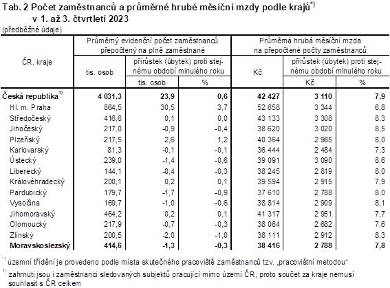 Průměrná mzda v Moravskoslezském kraji ve 3. čtvrtletí 2023 činila 38 957 Kč a proti stejnému období předchozího roku se zvýšila o 6,4 %. Kvůli růstu spotřebitelských cen v Česku však reálně výdělky v kraji klesly o 1,5 %. Subjekty se sídlem v kraji zaměstnávaly ve 3. čtvrtletí letošního roku 413,6 tisíce osob, což bylo o 0,5 % (o 1,9 tisíce osob) méně než před rokem.