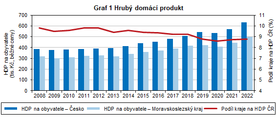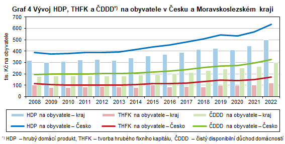 V zájmu srovnatelnosti vývoje Česka a Moravskoslezského kraje jsou v grafu zobrazeny přepočtené údaje na 1 obyvatele (i s vědomím toho, že se na tvorbě HDP podílejí i cizinci a není zohledněna mezikrajská dojížďka za prací). Graf zahrnuje též vývoj tvorby hrubého fixního kapitálu, přestože s rozdělením HDP souvisí pouze zprostředkovaně.