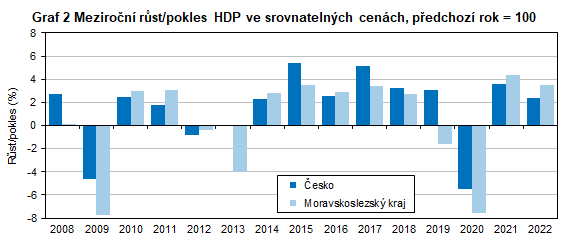V roce 2019 moravskoslezský HDP ve srovnatelných cenách (s. c.) jako v jediném kraji Česka meziročně poklesl o 1,6 % a v roce 2020 restriktivní opatření přijatá proti šíření koronaviru pokles HDP ještě zrychlil na 7,6 %. Ve většině krajů se jednalo o propad, který neměl od roku 1995 obdoby. Výsledkem byl propad regionálního HDP v s. c. v Moravskoslezském kraji na úroveň předkrizového roku 2008. Rok 2022 byl stejně jako rok předchozí ve znamení růstu HDP, v Moravskoslezském kraji se zvýšil o 3,5 %. Pouze ve třech krajích Česka HDP reálně poklesl, a to v krajích Vysočina o 3,5 %, Jihočeském o 1,2 % a Karlovarském o 0,1 %.
