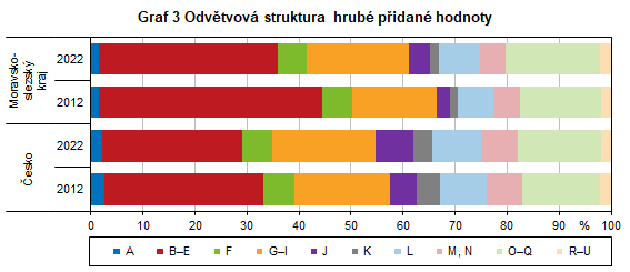 Zastoupení terciárního sektoru (obchod, služby, doprava, veřejná správa) na tvorbě HPH v Moravskoslezském kraji se v posledních letech zvyšoval na úkor sekundárního sektoru (průmysl a stavebnictví). Výjimku tvořil pouze rok 2021, kdy se vývoj obrátil. V roce 2022 na sekundární sektor připadalo 39,9 % HPH kraje, proti republikové úrovni byl podíl o 7,3 procentního bodu vyšší. Terciární sektor se v roce 2022 podílel na HPH kraje 58,5 % a za celostátním průměrem zaostával o 6,7 procentního bodu.