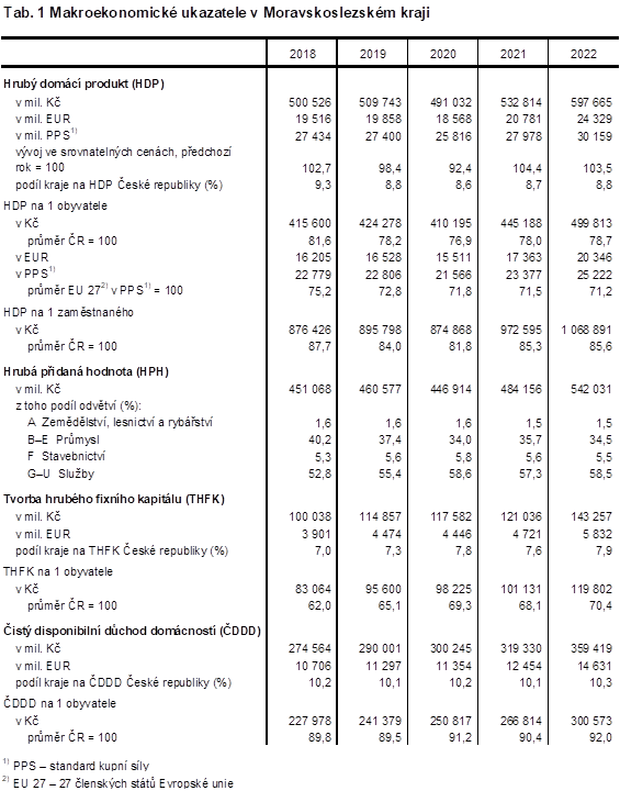 Hrubý domácí produkt dosáhl v roce 2022 v Moravskoslezském kraji 597,7 miliardy Kč a ve srovnatelných cenách se meziročně zvýšil o 3,5 procentního bodu. Odvětvová struktura hrubé přidané hodnoty se ve srovnání s republikovým průměrem vyznačovala vyšším podílem sekundárního sektoru (39,9 %). Naopak hodnoty v primárním (1,5 %) a zejména v terciárním sektoru (58,5 %) zaostávaly za průměrem Česka. Tvorba hrubého fixního kapitálu na obyvatele dosáhla v Moravskoslezském kraji 119,8 tisíce Kč a ve srovnání s hodnotou republikového průměru byla o 50,4 tisíce Kč nižší. Čistý disponibilní důchod domácností dosáhl v roce 2022 své dosavadní nejvyšší hodnoty 359,4 miliardy Kč. Při přepočtu na 1 obyvatele činil 300,6 tisíce Kč a proti republikovému průměru byl nižší o 26,2 tisíce Kč.
