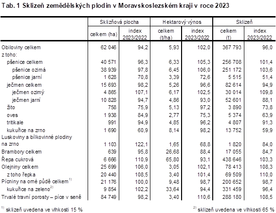 V roce 2023 se v Moravskoslezském kraji sklidilo 367,8 tisíce tun obilovin celkem, což bylo o 15,2 tisíce tun méně v porovnání s předchozím rokem. Na tomto poklesu se jednoznačně podílelo meziroční zmenšení sklizňových ploch o 5,8 % na 62,0 tisíce hektarů, neboť hektarový výnos vzrostl o 0,12 tuny. S výjimkou pšenice ozimé a ječmene ozimého, dosáhl hektarový výnos obilnin horších výsledků než v roce 2022. K meziročnímu poklesu produkce došlo v případě luskovin (o 16,0 %), brambor (o 15,3 %) a pícnin (o 1,3 %).