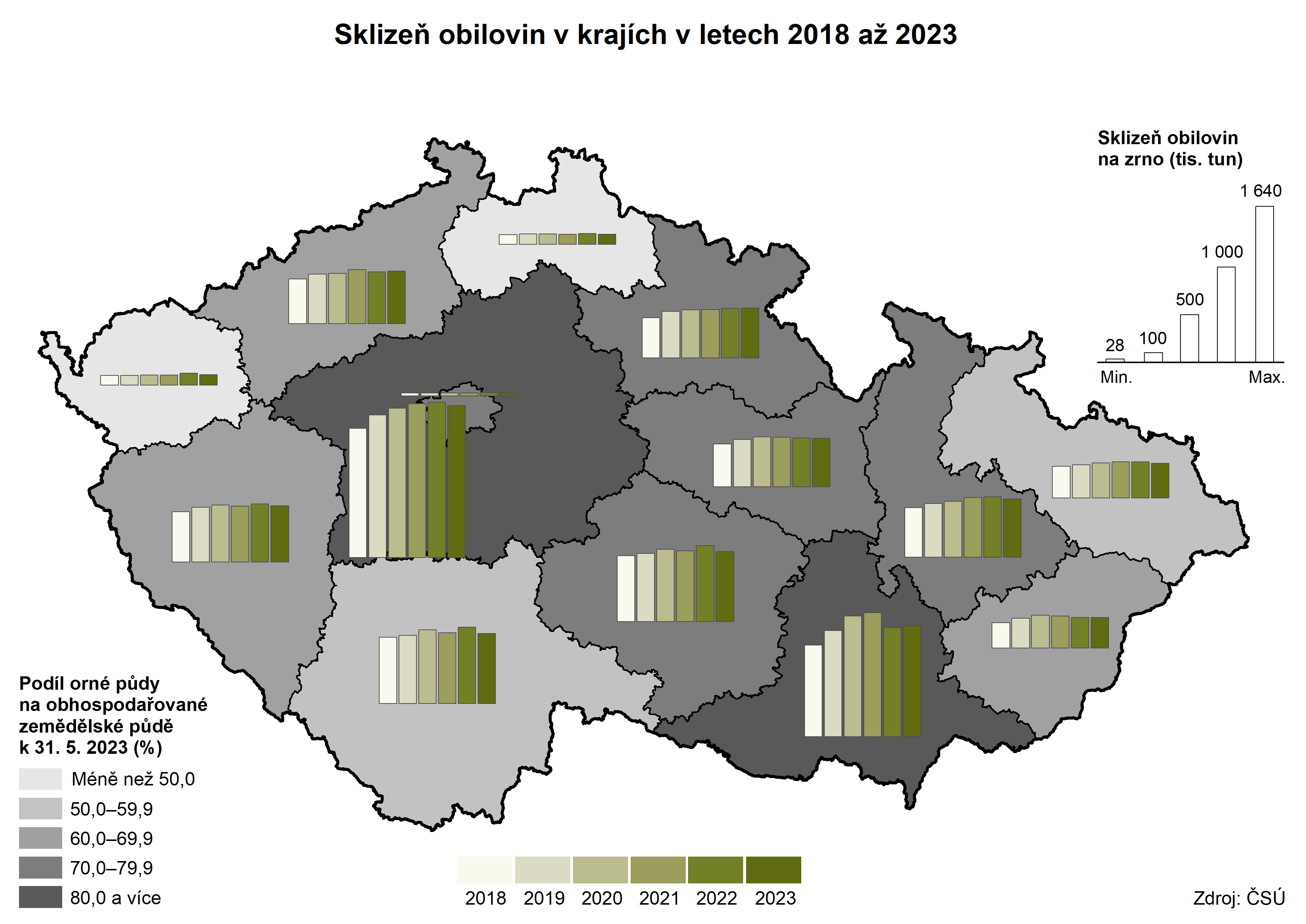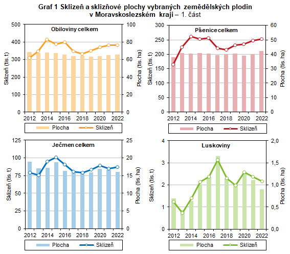 Obiloviny byly v Moravskoslezském kraji v roce 2023 sklizeny z plochy 62,0 tisíce hektarů. Tato výměra byla mezi kraji pátá nejmenší, prvenství si podobně jako v předchozích letech udržel Středočeský kraj s necelými 255 tisíci hektary. V Česku se loni sklidilo téměř 8,0 milionu tun zrna, v roce 2022 to bylo o 222,9 tisíce tun více. Meziroční pokles sklizně obilovin nastal v deseti krajích, přičemž největší úbytky se týkaly Jihočeského kraje (o 65,0 tisíce tun) a Vysočiny (o 59,6 tisíce tun). Naopak nejvyšší nárůst zaznamenali v Jihomoravském kraji (o 18,5 tisíce tun). Celkový objem sklizně obilovin v Moravskoslezském kraji dosáhl 367,8 tisíce tun, což znamenalo meziroční pokles o 4,0 %. V devíti krajích dosáhly průměrné hektarové výnosy obilovin v porovnání s rokem 2022 vyšších hodnot, v jednotlivých krajích se pohybovaly od 5,45 tuny v Karlovarském kraji do 6,51 tuny v Praze. V Moravskoslezském kraji činil výnos obilovin 5,93 tuny na hektar, což bylo o 0,12 tuny více než v roce 2022. Největšího meziročního nárůstu hektarového výnosu o 0,50 tuny dosáhli zemědělci v Jihomoravském kraji, naopak na Vysočině se hektarový výnos snížil o 0,25 tuny.