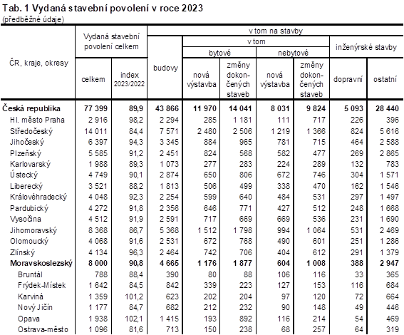 V Moravskoslezském kraji bylo v průběhu roku 2023 vydáno 8 000 stavebních povolení. V mezikrajském srovnání to byl po Středočeském a Jihomoravském kraji třetí nejvyšší počet a představoval podíl 10,3 % ze všech povolení vydaných v celém Česku. Proti roku 2022 se počet stavebních povolení v Moravskoslezském kraji snížil o 810 povolení (o 9,2 %). Meziroční pokles počtu vydaných stavebních povolení se týkal i všech ostatních krajů a pohyboval se v rozmezí od 1,8 % v Praze do 15,6 % ve Středočeském kraji.