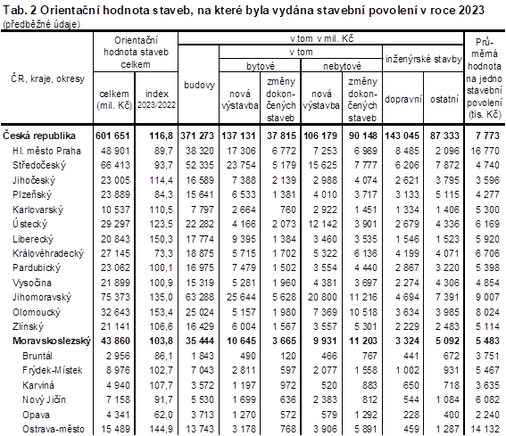 Orientační hodnota staveb, na které bylo v Moravskoslezském kraji v 1. až 4. čtvrtletí 2023 vydáno stavební povolení, dosáhla výše 43,9 miliardy Kč a kraj se touto částkou zařadil v mezikrajském srovnání na 4. místo za Jihomoravský kraj, Středočeský kraj a Prahu. Proti roku 2022 se orientační hodnota staveb v kraji zvýšila o 1,6 miliardy Kč (o 3,8 %). Tempo růstu orientační hodnoty staveb bylo v Moravskoslezském kraji výrazně nižší než celorepubliková hodnota, která se meziročně zvýšila o 16,8 %. Ve srovnání s předchozím rokem se orientační hodnota staveb snížila ve čtyřech krajích, největší pokles byl zaznamenán v Královéhradeckém kraji (o 26,7 %). Naopak k nejvýraznějšímu meziročnímu nárůstu orientační hodnoty staveb došlo v krajích Olomouckém (o 53,4 %) a Libereckém (50,3 %).