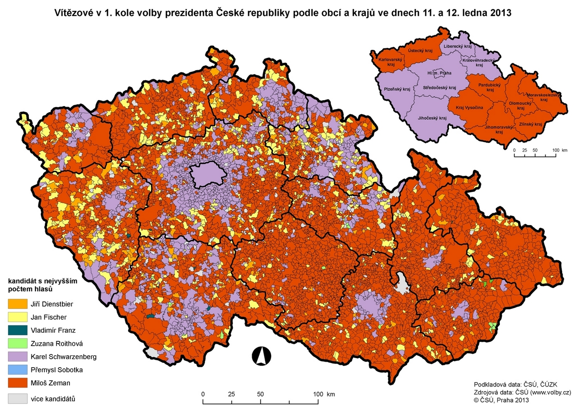 Volba prezidenta republiky 2013 (1. kolo) - vítězný kandidát podle obcí a krajů