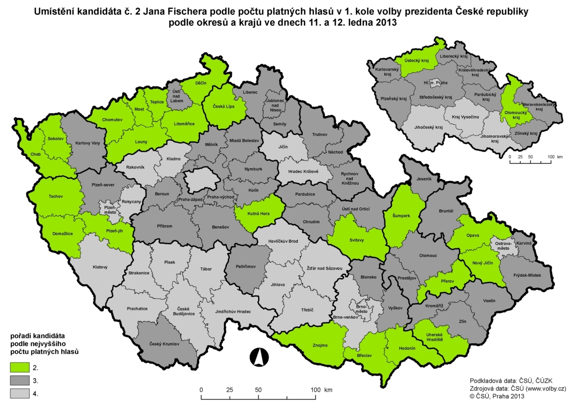 Volba prezidenta republiky 2013 (1. kolo) - umístění kandidáta č. 2 Jana Fischera podle počtu platných hlasů podle okresů a krajů