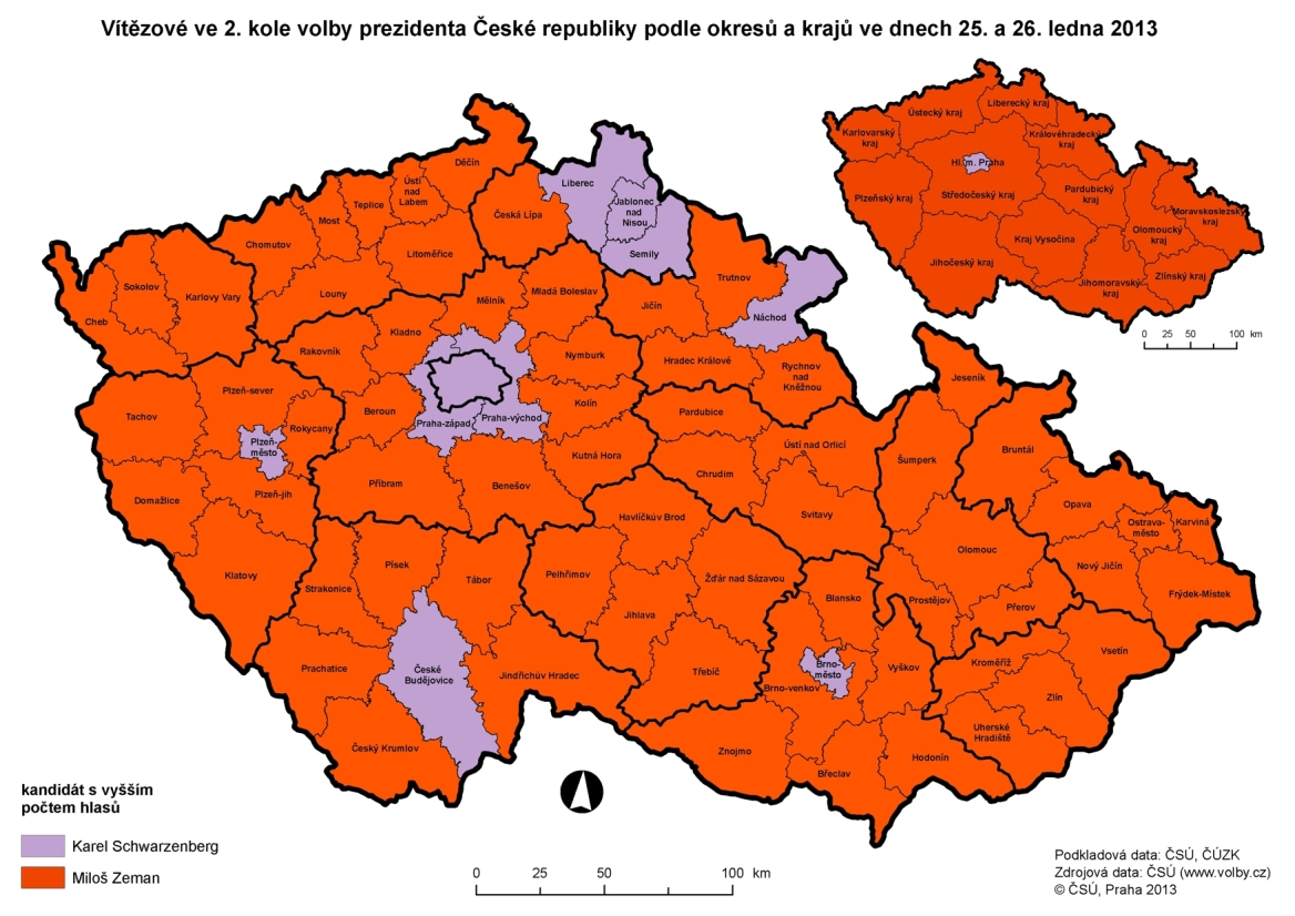 Volba prezidenta republiky 2013 (2. kolo) - vítězný kandidát podle okresů a krajů
