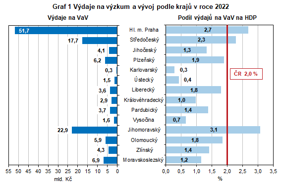 V roce 2022 dosáhly celkové výdaje na výzkum a vývoj 133,3 miliardy korun, proti roku 2021 vzrostly o 9,3 %. K největšímu meziročnímu nárůstu celkového objemu výdajů na výzkum a vývoj došlo v Karlovarském kraji (o 43,2 %). Dlouhodobě nejdůležitějším centrem českého výzkumu a vývoje je však nadále Praha, v níž bylo v roce 2022 realizováno 38,8 % celkových výdajů v České republice, konkrétně 51,7 miliardy Kč. S velkým odstupem za ní následovaly kraje Jihomoravský se 17,2 % a Středočeský s 13,2 %. Při přepočtu na regionální hrubý domácí produkt (HDP) však dosáhl nejvyšší hodnoty Jihomoravský kraj (3,1 %), v Praze a Středočeském kraji výdaje dosáhly 2,7 %, resp. 2,3 % HDP vytvořeného v příslušném kraji. Naproti tomu v Karlovarském kraji se podíl pohyboval jen kolem 0,3 %.