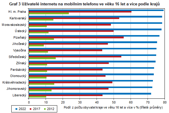 Rovněž roste podíl osob, které používají internet na mobilním telefonu. V roce 2022 jej používalo v hlavním městě Praze 79,4 % uživatelů (z obyvatel ve věku 16 let a více), v roce 2012 to bylo pouze 23,5 %. K největšímu vzestupu došlo v Moravskoslezském kraji (z 10,6 % v roce 2012 na 78,4 % v roce 2022) a v Jihočeském kraji (z 8,8 % na 75,5 %).