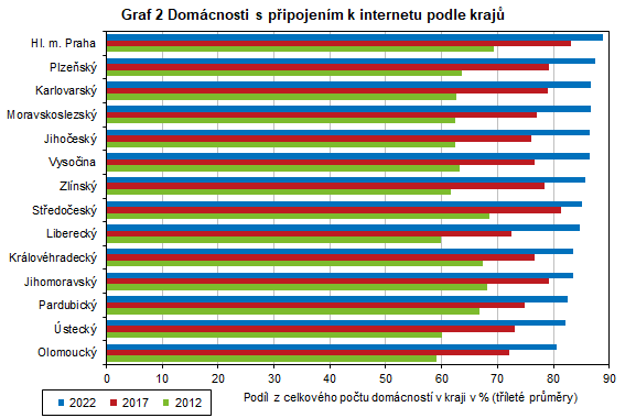 Přestože se podíl domácností vybavených počítačem už v posledních letech nijak výrazně nemění (v roce 2022 činil v celé republice 80,7 %), podíl domácností s připojením na internet se stále zvyšuje. V roce 2022 dosáhl v republikovém průměru 85,3 %, nejvíce v Praze (88,8 %), nejméně v Olomouckém kraji (80,5 %).