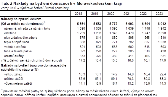 Tab. 2 Náklady na bydlení domácností v Moravskoslezském kraji
