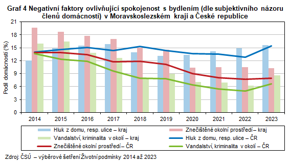 Z hlediska problémů spojených s bydlením byl v Moravskoslezském kraji dlouhodobě patrný jeden z nejvyšších podílů domácností stěžujících si na znečištěné okolní prostředí a vandalství či kriminalitu v okolí (10,2 %, resp. 8,6 %). Při posledním šetření tyto problémy představovaly druhý, resp. čtvrtý nejvyšší podíl mezi kraji. Oba tyto problémy nejvíce trápily domácnosti v hlavním městě Praze (14,0 %, resp. 12,4 %). Naopak nejmenší problémy s těmito jevy měly domácnosti na Vysočině (3,3 % v případě znečištěného okolního prostředí) a v Královéhradeckém kraji (2,1 % v případě vandalství, kriminality). Nadprůměrné ve srovnání s republikovým průměrem bylo rovněž zastoupení moravskoslezských domácností potýkajících se s hlukem z domu či ulice (15,6 %), s vlhkostí v bytě (9,4 %) a s tmavým bytem (3,7 %).