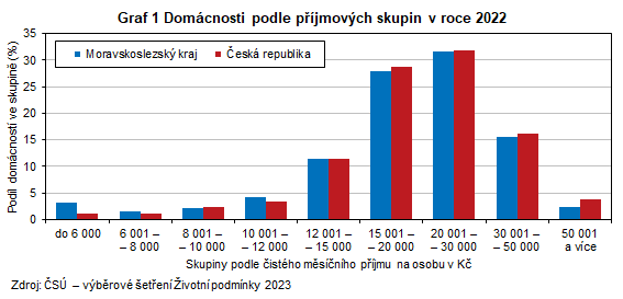 V Moravskoslezském kraji byl patrný neustálý nárůst podílu domácností s průměrným čistým měsíčním příjmem na osobu nad 15 tisíc Kč – z 36,8 % v roce 2018 na 77,4 % v roce 2023. Přesto zůstal tento podíl o 3,2 procentního bodu pod republikovým průměrem a byl zároveň druhý nejnižší mezi kraji. Nejnižší podíl byl zaznamenán v Olomouckém kraji (72,6 %), nejvyššího bylo dosaženo v Praze (87,5 %). Podíl domácností v Moravskoslezském kraji s čistým měsíčním příjmem na osobu v pásmu 10 až 15 tisíc Kč činil 15,7 % a byl ve srovnání s republikovým průměrem (14,8 %) vyšší, každoročně se však rozdíl snižuje. Již třetím rokem v řadě vzrostlo zastoupení domácností v nejnižším příjmovém pásmu do 6 tisíc Kč (z 2,8 % v roce 2021 na 3,1 % v roce 2022) a mezi kraji se opět jednalo o nejvyšší hodnotu.
