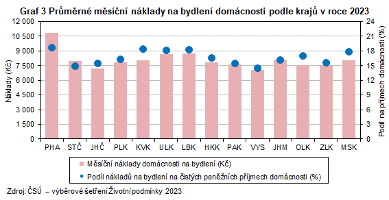 Graf 3 Průměrné měsíční náklady na bydlení domácnosti podle krajů v roce 2023
