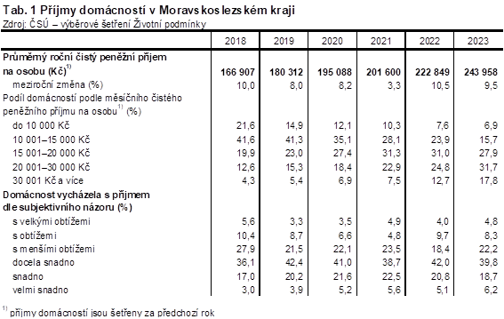 Příjmy domácností v Moravskoslezském kraji (zjišťováno za rok 2022) rostly sice rychlejším tempem než v celém Česku, nadále však patřily k nejnižším mezi kraji. Průměrné čisté peněžní příjmy na osobu v domácnosti dosáhly 244,0 tisíce Kč ročně, ve srovnání s rokem 2021 vzrostly o 9,5 %. Za republikovým průměrem zaostávaly o 15,9 tisíce Kč. Podíl nákladů na bydlení na čistých měsíčních peněžních příjmech domácnosti meziročně vzrostl o 1,8 procentního bodu na 17,9 % a byl pátým nejvyšším mezi kraji. Více než pětina domácností Moravskoslezského kraje pak považovala tyto náklady za velkou zátěž.