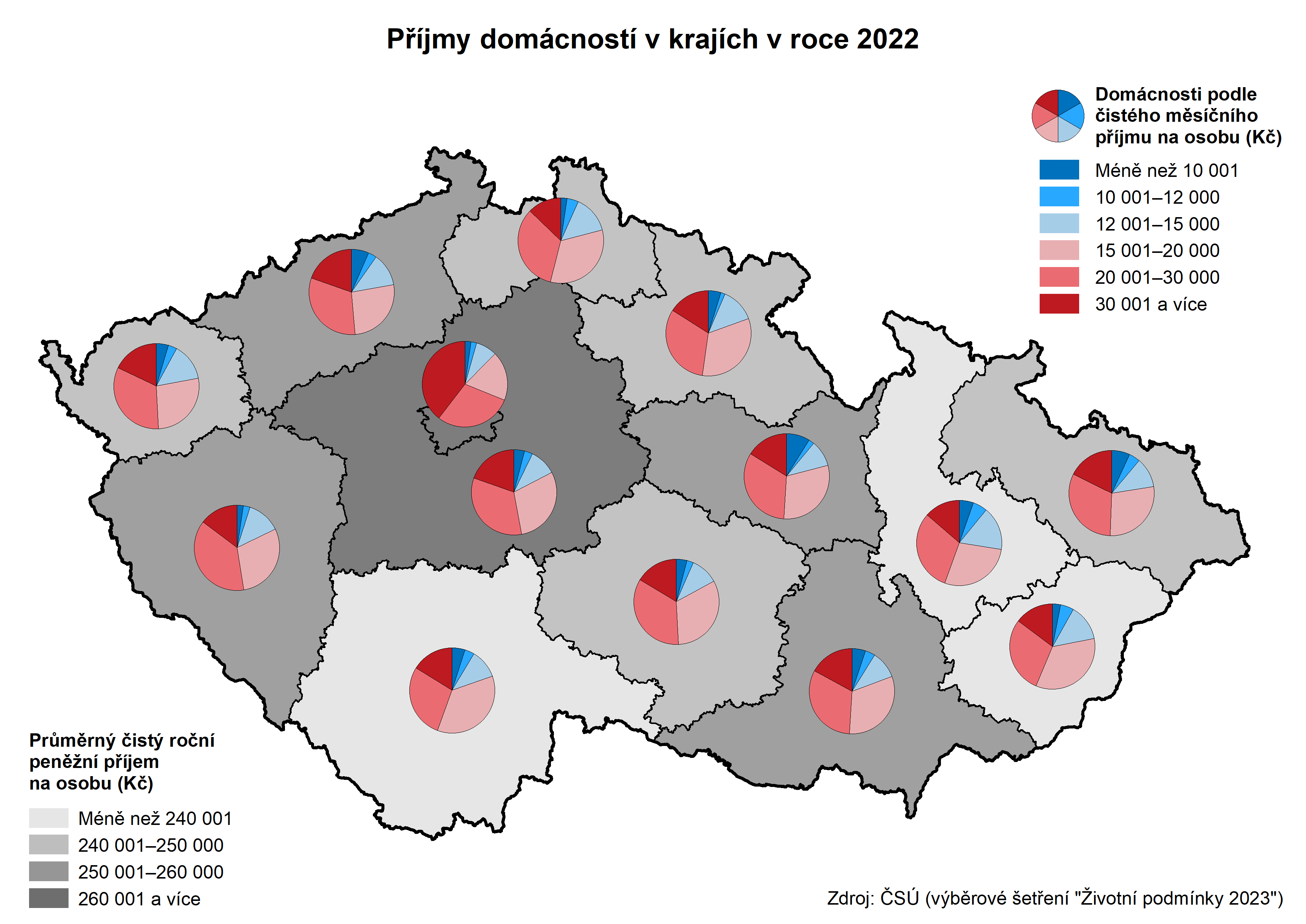 Kartogram Příjmy domácností podle krajů v roce 2022