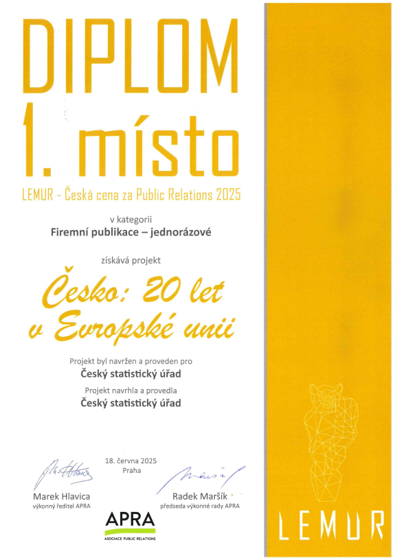 Český statistický úřad zvítězil v jubilejním 20. ročníku soutěže Lemur – Česká cena za public relations: 1. místem v kategorii firemní publikace (jednorázové) byla oceněna publikace Česko: 20 let v Evropské unii. Soutěž každoročně vyhlašuje Asociace Public Relations (APRA). Oceňovány jsou PR projekty, které obsahují kreativní řešení, jsou v souladu s etickými pravidly oboru a mají prokazatelně pozitivní dopad na reputaci zadavatele.