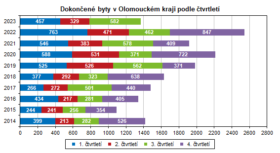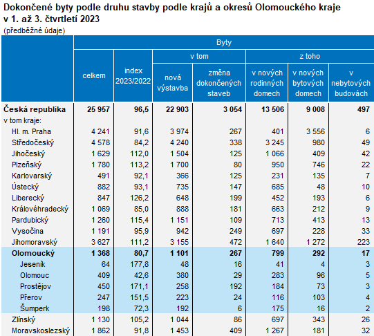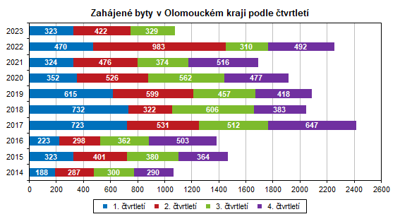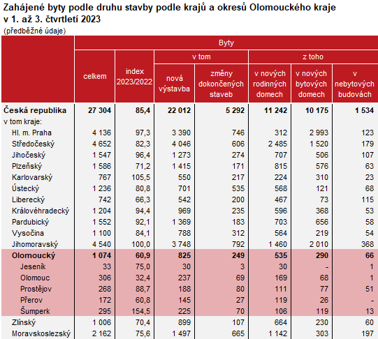Podle předběžných dat byla v Olomouckém kraji v 1. až 3. čtvrtletí 2023 zahájena výstavba 1 074 bytů. Ve srovnání se stejným obdobím minulého roku jich bylo o 689 méně, což odpovídalo meziročnímu snížení o 39,1 %. K poklesu došlo ve všech sledovaných kategoriích. Snížil se jak počet zahájených bytů novou výstavbou na 825 bytů (meziroční pokles o 591 bytů, tj. o 41,7 %), tak změnou již dokončených staveb na 249 bytů (meziroční pokles o 98 bytů, tj. o 28,2 %).