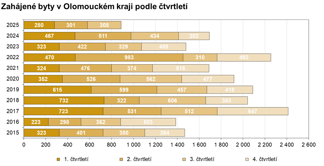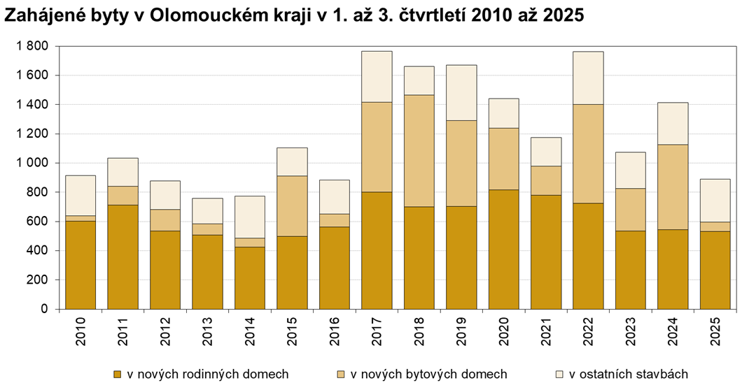 Podle předběžných údajů ČSÚ bylo v Olomouckém kraji v 1. až 3. čtvrtletí 2025 zahájeno 889 bytů, tj. o 37,0 % méně než v 1. až 3. čtvrtletí 2024. V novostavbách bylo zahájeno 634 bytů. V důsledku meziročního snížení o 44,3 % byl jejich počet nejnižší za uplynulých 11 let. Zbývajících 255 bytů bylo zahájeno v rámci změn již dokončených staveb, což bylo o 6,6 % méně než ve stejném období předchozího roku.