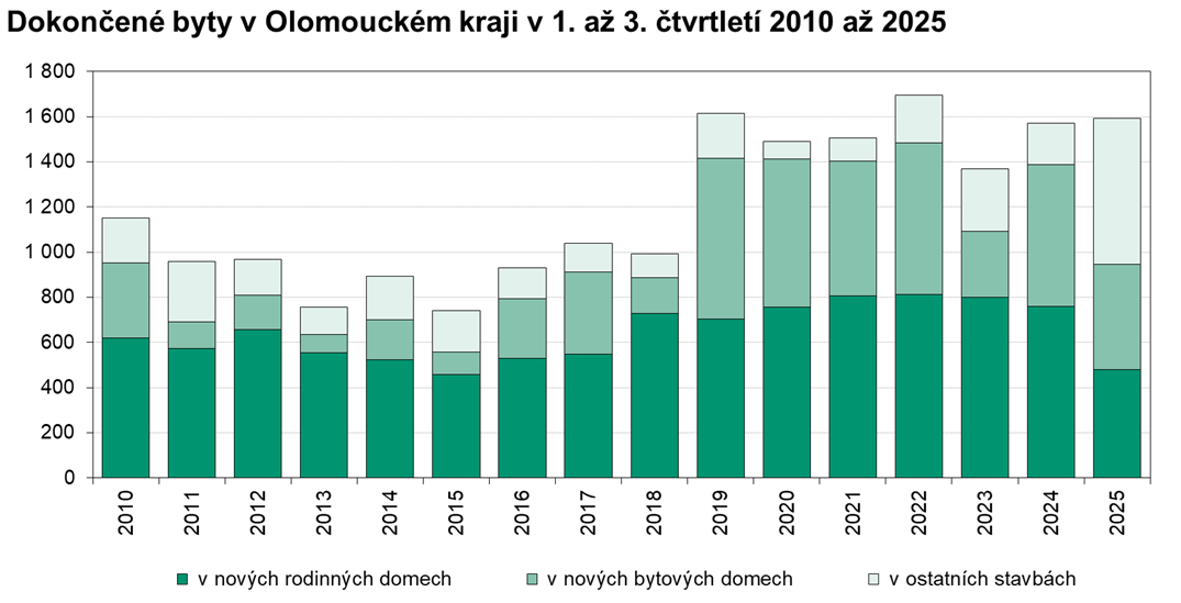 V 1. až 3. čtvrtletí 2025 bylo v Olomouckém kraji podle předběžných údajů ČSÚ dokončeno 1 594 bytů. V meziročním srovnání došlo k nárůstu o 1,5 % na 3. nejvyšší hodnotu od roku 2001. V novostavbách bylo dokončeno 949 bytů (meziročně o 31,7 % méně) a v rámci změn již dokončených staveb 645 bytů (meziročně o 256,4 % více). V podrobnějším členění bylo 480 bytů zkolaudováno v novostavbách rodinných domů (meziročně o 36,8 % méně) a 467 bytů v novostavbách bytových domů (meziročně o 25,8 % méně). Jestliže počet dokončených bytů v novostavbách bytových domů klesl v 1. až 3. čtvrtletí na 2. nejnižší hodnotu od roku 2019, v případě novostaveb rodinných domů se jednalo o nejnižší hodnotu za posledních 10 let.