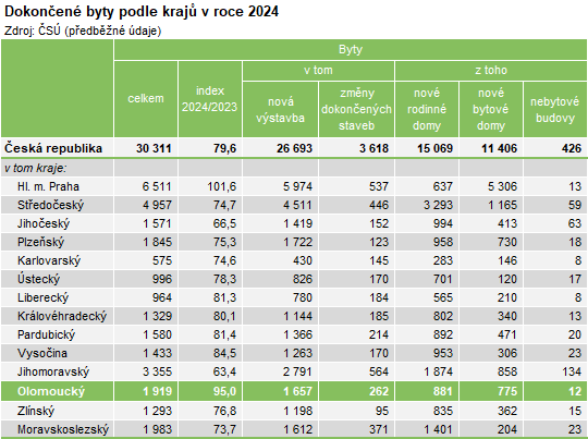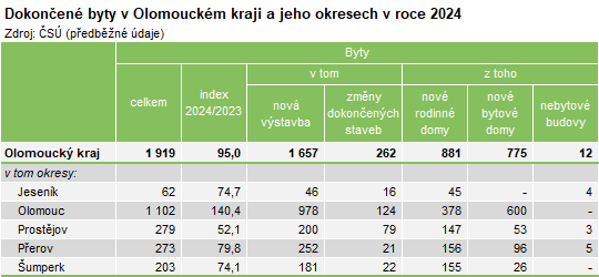 V roce 2024 bylo v Olomouckém kraji dokončeno 1 919 bytů. V porovnání s rokem 2023 došlo k poklesu o 5,0 %, přesto počet dokončených bytů zůstal 6. nejvyšší od roku 1992. Počet a struktura zahájených bytů se s jistým zpožděním promítá do počtu a struktury bytů dokončených. Zcela nejvíce bytů je v rámci kraje dlouhodobě dokončováno na Olomoucku.