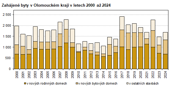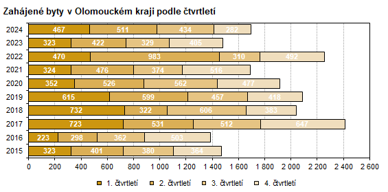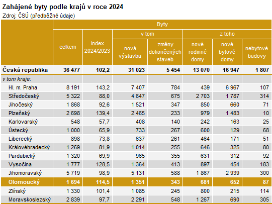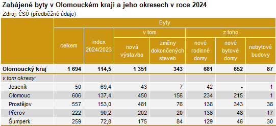 Podle předběžných údajů ČSÚ bylo v Olomouckém kraji v roce 2024 zahájeno 1 694 bytů, tj. o 14,5 % více než v roce 2023. V novostavbách, které reprezentují klíčovou skupinu rezidenční výstavby, bylo zahájeno 1 351 bytů. I přes výrazný meziroční růst o 22,3 % zůstal jejich počet 2. nejnižší za uplynulých 8 let. Zbývajících 343 bytů bylo zahájeno v rámci změn již dokončených staveb, což bylo o 8,3 % méně než v roce předchozím.