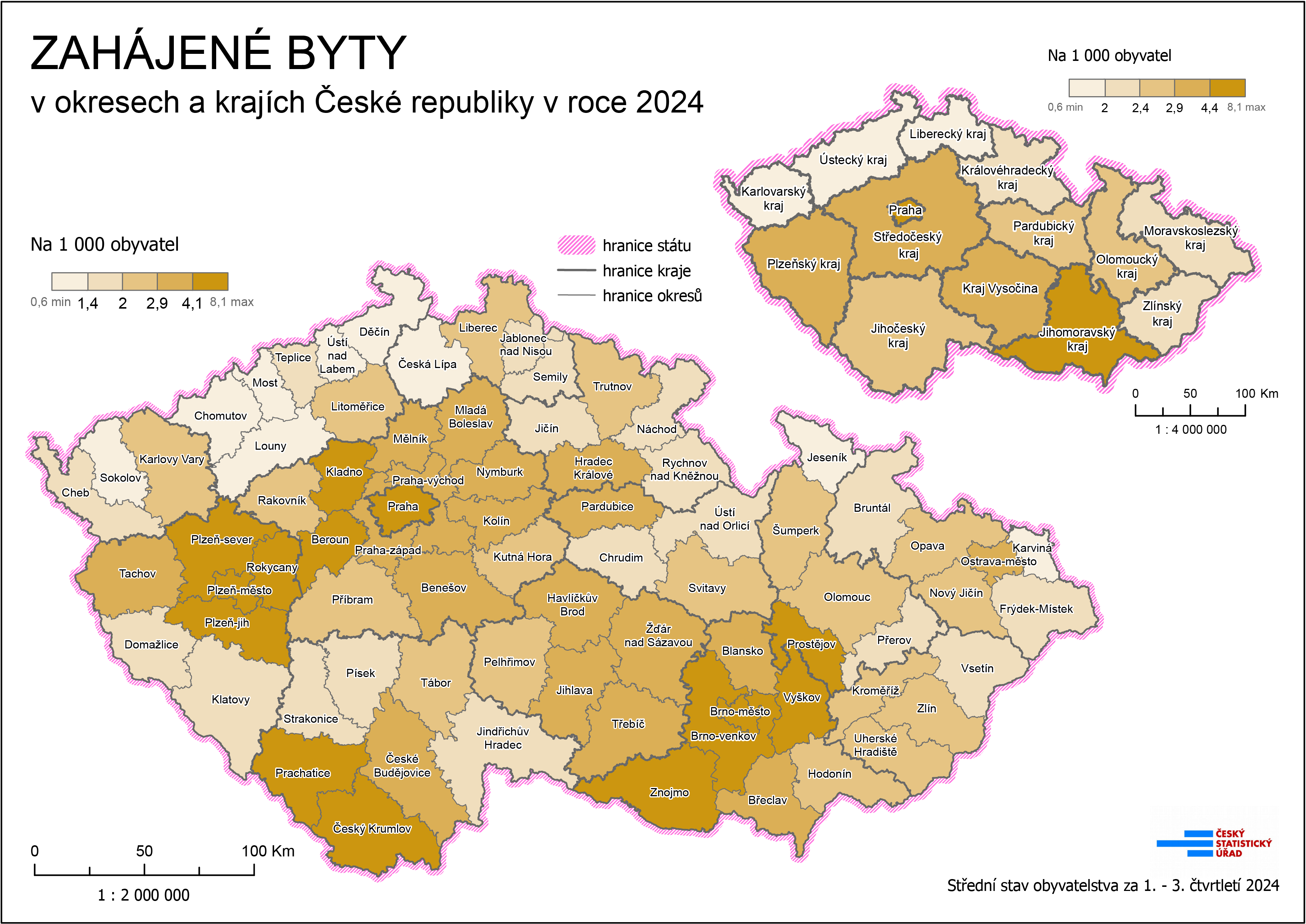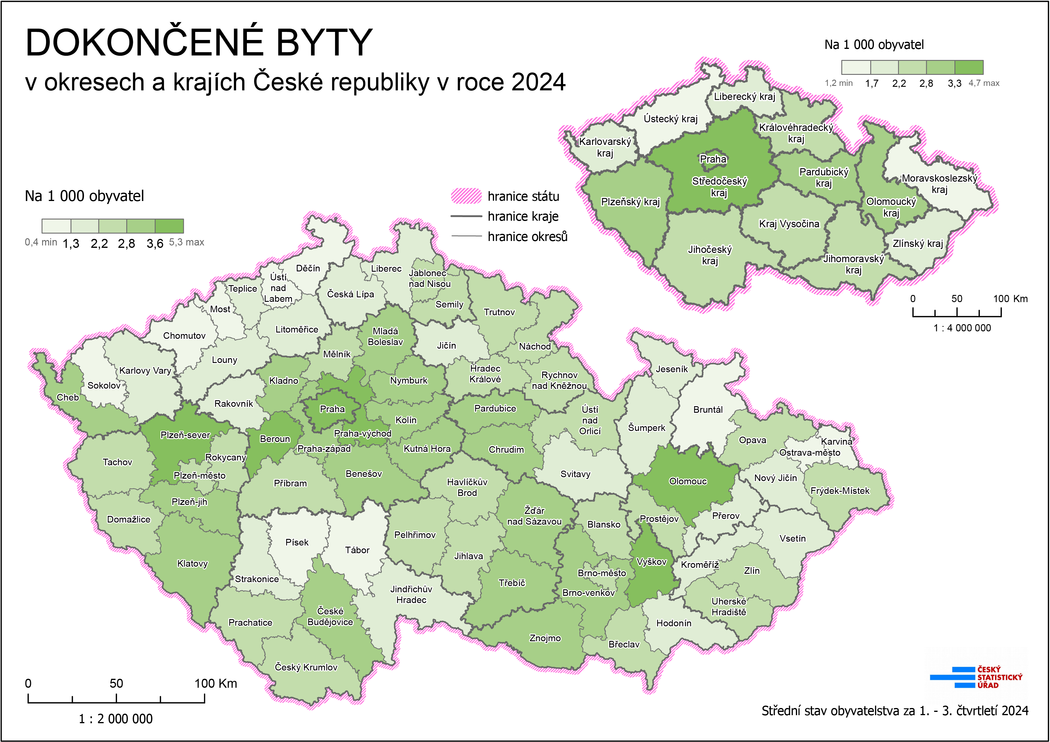 V České republice bylo během roku 2024 dokončeno 30 311 bytů, tj. o 20,4 % méně než v roce 2023. Jednalo se o nejnižší hodnotu za uplynulých 7 let. Pod pětinové snížení počtu dokončených bytů se podepsala jak nová výstavba (meziroční pokles o 21,1 %), tak změny dokončených staveb (meziroční pokles o 14,7 %). Meziroční vyšší tempo dokončené bytové výstavby zaznamenala pouze Praha (o 1,6 %). Pro zbývajících 13 krajů byl charakteristický meziroční pokles. Relativně nejnižší úbytek vykázal kraj Olomoucký (o 5,0 %) následovaný Krajem Vysočina (o 15,5 %). Relativně nejvyšší meziroční úbytky v počtu dokončených bytů příslušely kraji Jihomoravskému (o 36,6 %), Jihočeskému (o 33,5 %) a Moravskoslezskému (o 26,3 %). Téměř polovina všech vloni dokončených bytů v České republice se nacházela v Praze (6 511 bytů), v kraji Středočeském (4 957 bytů) a kraji Jihomoravském (3 355 bytů).
