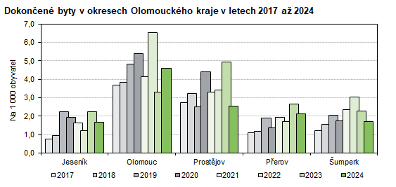 V dalším pořadí byl nejvyšší počet dokončených bytů v kraji sledován v okrese Prostějov (279 bytů, tj. 14,5 % z celého kraje), Přerov (273 bytů, tj. 14,2 %) a Šumperk (203 bytů, tj. 10,6 %). Nejnižší počet náležel okresu Jeseník (62 bytů, tj. 3,2 %). Na Olomoucku se počet dokončených bytů meziročně výrazně zvýšil, a to o 40,4 %. Meziroční pokles charakterizoval okresy Prostějov (o 47,9 %), Šumperk (o 25,9 %), Jeseník (o 25,3 %) a Přerov (o 20,2 %).