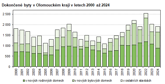 V novostavbách bylo dokončeno 1 657 bytů (meziročně o 1,1 % méně) a v rámci změn již dokončených staveb 262 bytů (meziročně o 24,1 % méně). V podrobnějším pohledu bylo 881 bytů zkolaudováno v novostavbách rodinných domů (meziročně o 18,4 % méně) a 775 bytů v novostavbách bytových domů (meziročně o 32,9 % více). Jestliže počet dokončených bytů v novostavbách rodinných domů klesl na sedmileté minimum, v případě novostaveb bytových domů se jednalo o 3. nejvyšší hodnotu od vzniku Olomouckého kraje v roce 2000.