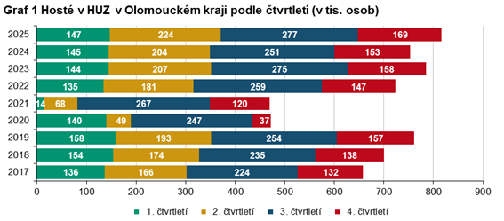 Podle předběžných údajů bylo v roce 2025 ubytováno v hromadných ubytovacích zařízeních cestovního ruchu v Olomouckém kraji celkem 816,5 tis. hostů. Od zahájení sledování této statistiky po revizi šetření v roce 2012 se jednalo o dosud nejvyšší počet ubytovaných hostů v krajských HUZ. Oproti roku 2024 došlo k nárůstu o 8,4 %, což bylo nejvíce i v mezikrajském srovnání. Zvýšil se jak počet hostů z tuzemska, kterých bylo evidováno 664,5 tis. (tj. meziročně o 7,9 % více), tak počet hostů ze zahraničí, kterých se ubytovalo 152,0 tis. (tj. meziročně o 10,8 % více). V kraji se ubytovalo 3,5 % z celkového počtu hostů v HUZ České republiky, přičemž podíl zahraničních hostů v kraji tvořil pouze 1,4 % z celkového počtu nerezidentů. Cílovou destinací většiny zahraničních hostů v České republice nadále zůstává Praha, kde nerezidenti představovali 61,4 % všech ubytovaných.