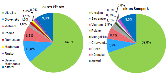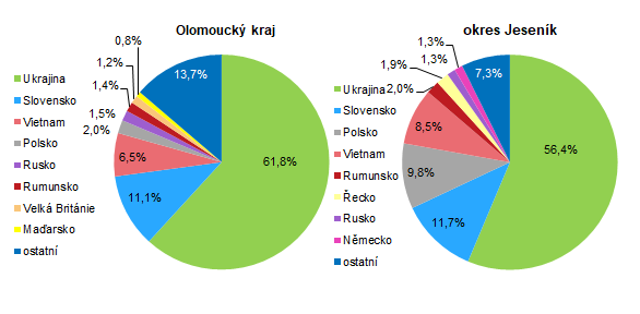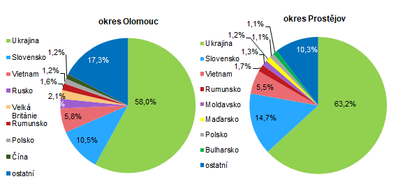 Občané Ukrajiny tvořili největší skupinu mezi cizinci ve všech okresech kraje. Cizinci pocházející ze zemí Evropské unie se podíleli na celkovém počtu cizinců v daném okrese od 15,4 % v okrese Šumperk do 28,9 % v okrese Jeseník. Ve všech okresech kraje, s výjimkou okresu Jeseník, mezi tři největší skupiny cizinců patřily osoby s ukrajinským, slovenským a vietnamským občanstvím. V okrese Jeseník třetí nejpočetnější skupina náležela občanům Polska. V každém okrese se mezi 8 nejčastějších občanství zařadila alespoň jedna skupina cizinců, která se neobjevila mezi top 8 v ostatních okresech kraje. V okrese Jeseník to byly osoby s řeckým občanstvím, na Olomoucku se na páté příčce umístili občané Velké Británie a na 8. pozici občané Číny, 5. příčku na Prostějovsku obsadili občané Moldavska a 8. pozici měli občané Bulharska. V okrese Přerov top 8 uzavíraly osoby s občanstvím Severní Makedonie a v okrese Šumperk 5. místo obsadili občané Mongolska a hned další místo patřilo Chorvatům.