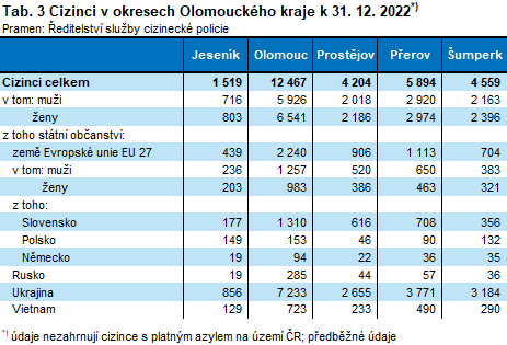 Cizinci podle státního občanství v Olomouckém kraji a jeho okresech k 31. 12. 2022