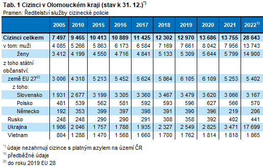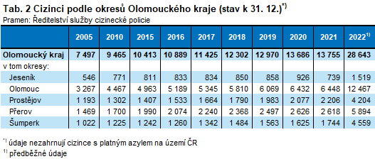 Podle předběžných údajů se počet cizinců na území Olomouckého kraje meziročně více než zdvojnásobil. Výrazně se zvýšil podíl žen mezi cizinci a poprvé v roce 2022 byl počet žen vyšší než počet mužů. Podíl cizinců na obyvatelstvu celkem se zvýšil na 4,5 %, ale v mezikrajském srovnání byl nejnižší. Ze zemí Evropské unie (EU 27) pocházelo 18,9 % cizinců.