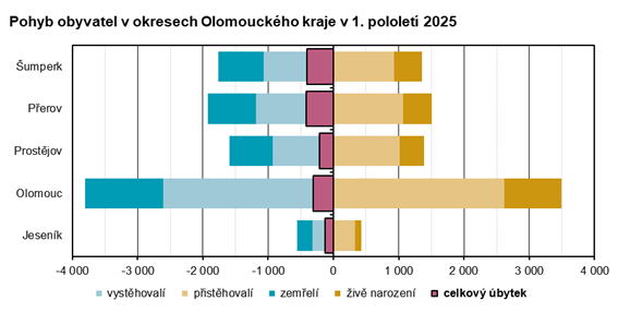 Podle předběžných údajů žilo na území Olomouckého kraje k 30. 6. 2025 celkem 630 024 obyvatel. Od začátku roku se jejich počet snížil o 1 476 osob. Počet zemřelých převýšil počet narozených o 1 323 osob a z Olomouckého kraje se vystěhovalo o 153 osob více, než se jich do kraje přistěhovalo. Pokles počtu obyvatel zaznamenaly všechny kraje s výjimkou Středočeského, ve kterém byl evidován meziroční nárůst počtu obyvatel. V rámci Olomouckého kraje se počet obyvatel snížil ve všech okresech, přirozený úbytek vykázaly všechny okresy, migrační úbytek byl evidován pouze v okresech Přerov a Šumperk.