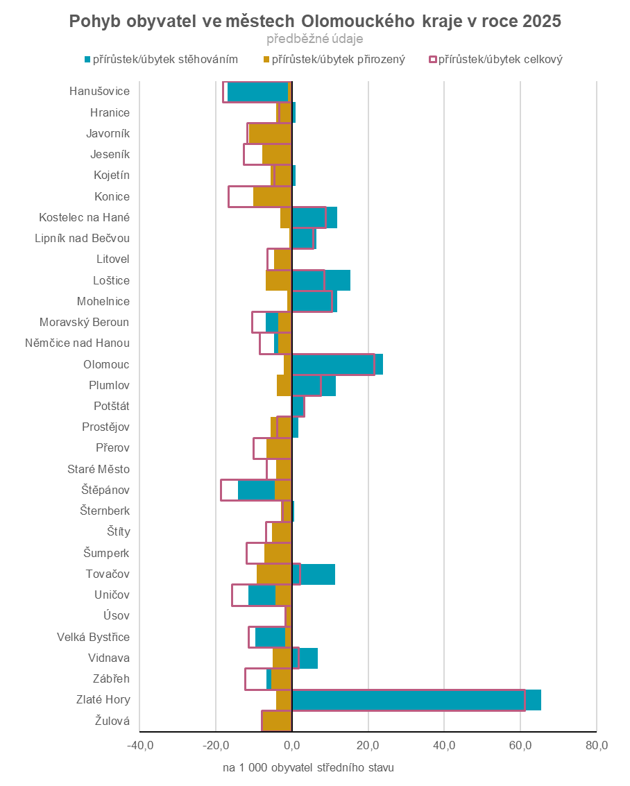 Stěhováním získalo nové občany 14 měst. V absolutním vyjádření nejvíce v krajském městě Olomouci (+2 457 osob), relativně nejvíce ve Zlatých Horách (+65,4 ‰).