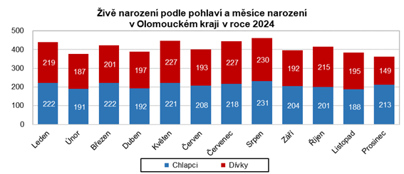 V roce 2024 se maminkám z Olomouckého kraje nejvíce dětí narodilo v měsíci srpnu (461 živě narozených), druhý nejvyšší počet živě narozených připadl na květen (448 dětí). Nejméně dětí se narodilo v prosinci (362 dětí).