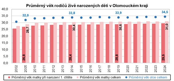 Velmi podobně se v kraji vyvíjel i průměrný věk matky při narození prvního dítěte. V roce 2002 měla matka v Olomouckém kraji při porodu prvního dítěte v průměru 25,5 let. V roce 2022 přesáhl věk prvorodiček hranici 29 let a v roce 2024 měla prvorodička v průměru 29,5 let, tj. o čtyři roky více než v roce 2002.