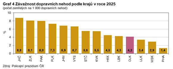 Podle předběžných údajů šetřila Policie České republiky v roce 2025 v Olomouckém kraji 5 526 dopravních nehod, což bylo o 1 029 nehod (-15,7 %) méně než v předchozím roce. Nehodovost meziročně klesla v dalších devíti krajích České republiky, přičemž v Olomouckém kraji byl pokles nejvýraznější. Zbylé čtyři kraje zaznamenaly nárůst počtu dopravních nehod. Nejvíce se zvýšila nehodovost v Královéhradeckém kraji (+8,4 %), následoval kraj Vysočina (+4,4 %), Plzeňský (+1,7 %) a Zlínský kraj (+1,0 %). V celé ČR bylo šetřeno 85 518 dopravních nehod, což představovalo meziroční snížení o 7,3 %.
