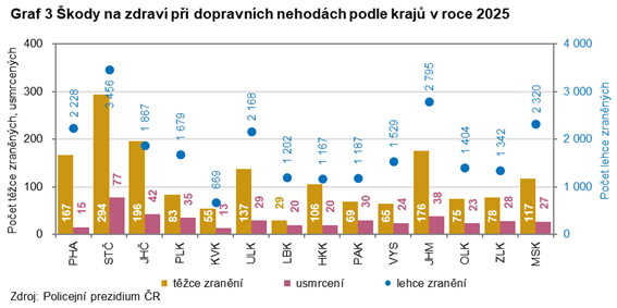 V roce 2025 přišlo na silnicích v celé České republice o život 421 osob, což bylo o 17 osob méně ve srovnání s předchozím rokem. Historicky se jednalo o nejnižší počet úmrtí při dopravních nehodách od roku 1961, kdy policie tyto statistiky vede. V kraji zemřelo při dopravních nehodách 23 osob, což bylo o 2 osoby více než v roce 2024. Těžce bylo zraněno 75 účastníků nehod, tj. o 7 více než v předchozím roce a s lehkým zraněním vyvázlo z nehod 1 404 osob, což bylo o 92 více oproti předešlému roku.