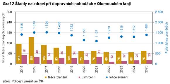 Podle předběžných údajů Policejního prezidia České republiky bylo v roce 2025 na území Olomouckého kraje způsobeno 5 526 dopravních nehod. O život při nich přišlo 23 osob, 75 osob bylo těžce zraněno a 1 404 osob se zranilo lehce. Celková hmotná škoda byla vyčíslena na 456,7 mil. Kč.
