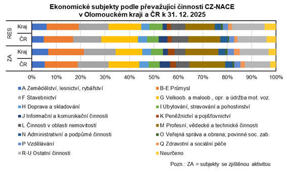 V RES jsou uvedeny všechny jednotky bez ohledu na jejich ekonomickou aktivitu. Za subjekt se zjištěnou ekonomickou aktivitou je považován ten, který je plátcem daně z příjmů, daně z přidané hodnoty nebo platí pojistné na sociální zabezpečení za zaměstnance či jako osoba samostatně výdělečně činná. Ke konci roku 2025 byla aktivita v Olomouckém kraji zjištěna u 82 215 subjektů (59,8 % z celkového počtu subjektů), což byla pátá nejnižší hodnota v mezikrajském srovnání. Oproti konci roku 2024 se počet subjektů se zjištěnou aktivitou v kraji zvýšil o 2 718, tj. o 3,4 %.