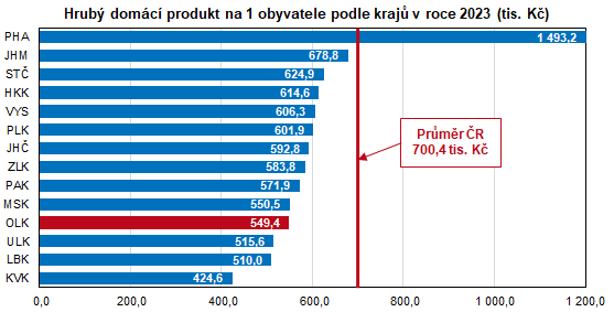 V přepočtu na 1 obyvatele kraje vycházel HDP ve výši 549,4 tis. Kč, což byla 4. nejnižší hodnota ve srovnání 14 krajů ČR. HDP na obyvatele v kraji v roce 2023 představoval 78,4 % republikové hodnoty, která však byla překročena pouze v případě hlavního města Prahy, kde byla dosažená hodnota HDP na obyvatele 2,7krát vyšší než v Olomouckém kraji. Bez započtení údajů za hlavní město by byla krajská hodnota HDP na obyvatele na úrovni 93,8 % republikového průměru.