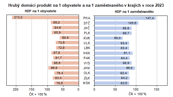 Vysoký údaj za Prahu je dán také velkým počtem zaměstnaných přijíždějících do hlavního města za prací z jiných regionů. Přepočet HDP na 1 zaměstnaného (s místem pracoviště v kraji včetně sebezaměstnaných, tj. zahrnující i dojíždějící z jiných krajů) pak v Olomouckém kraji dosáhl v roce 2023 hodnoty 1 165,6 tis. Kč, což představovalo 82,4 % z průměrné částky za Českou republiku.