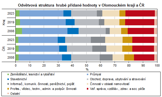 Hrubá přidaná hodnota (HPH), která představuje souhrn přidaných hodnot jednotlivých odvětví (tj. HDP bez daní a případných dotací na produkty, které nelze rozdělit mezi jednotlivá odvětví), dosáhla v roce 2023 v Olomouckém kraji hodnoty 319,2 mld. Kč. Na hodnotě HPH kraje se v roce 2023 primární sektor, tj. zemědělství, lesnictví a rybářství, podílel 2,7 %. Sekundární sektor, představovaný průmyslovými odvětvími a stavebnictvím, zaujímal 36,6 %. Terciární sektor, zahrnující obchod, služby, dopravu, veřejnou správu atd., se na celkovém objemu HPH za Olomoucký kraj podílel 60,7 %. Podíl terciárního sektoru se v kraji každoročně zvyšuje, průměrného zastoupení na objemu HPH za Českou republiku stále nedosáhl (65,0 % v roce 2023).