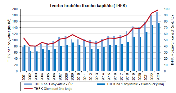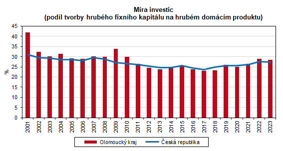 Podíl THFK na hrubém domácím produktu, tzv. míra investic, se v posledních třech letech v Olomouckém kraji držela nad republikovým průměrem, přestože v roce 2023 zaznamenala pokles. Míra investic se snížila z 29,0 % v roce 2022 na 28,4 % v roce 2023, jednalo se o čtvrtý nejvyšší podíl v mezikrajském srovnání. Vyšší byl zjištěn ve Středočeském, Karlovarském a Ústeckém kraji.