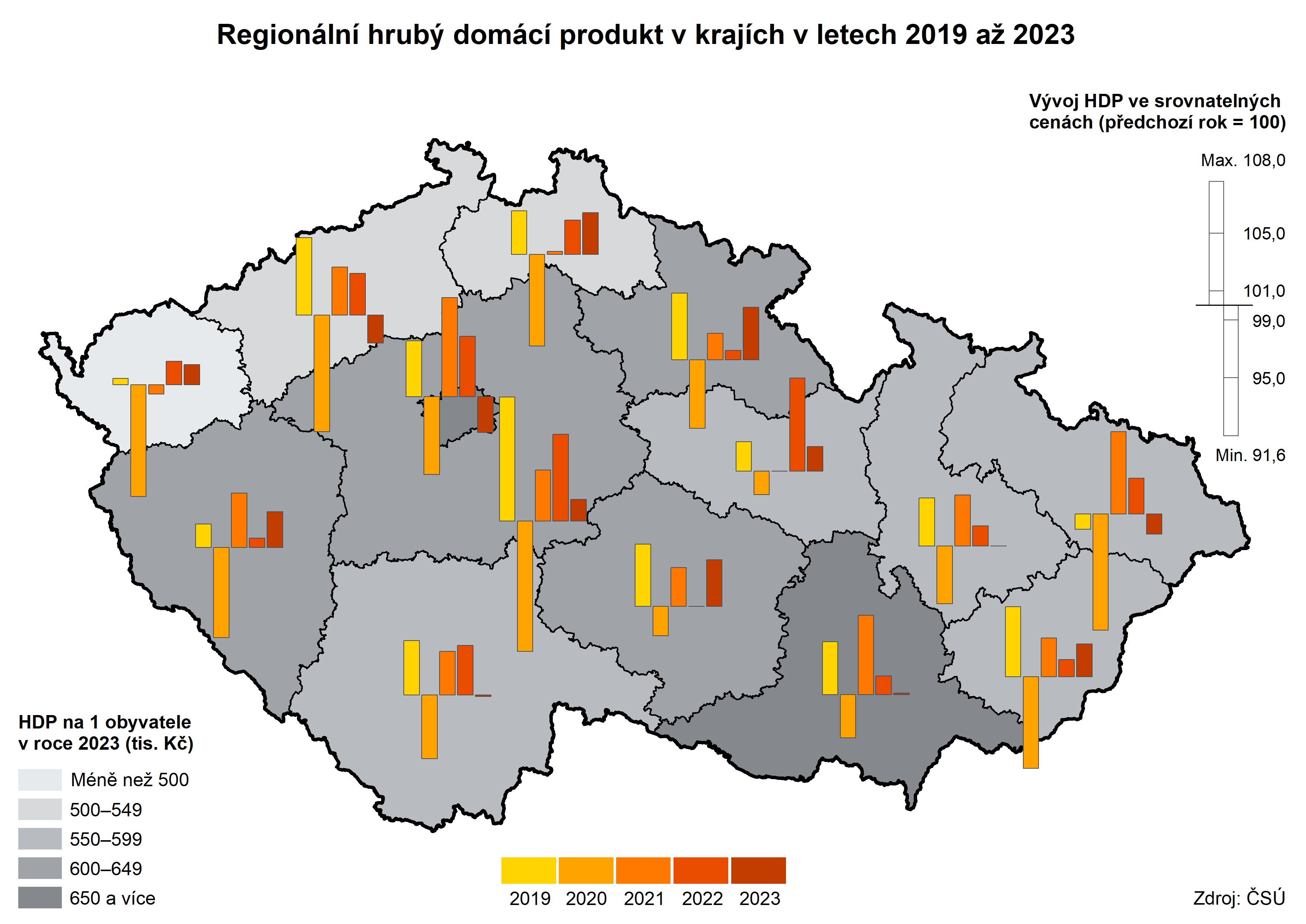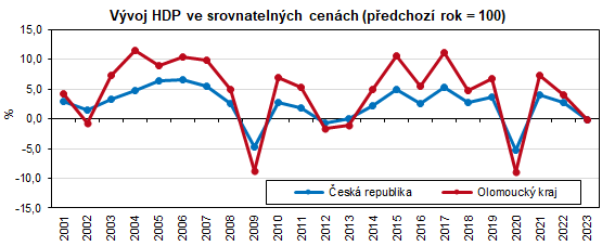 V běžných cenách se HDP kraje každoročně zvyšoval. Pokud ale budeme hodnotit vývoj ve srovnatelných cenách, v Olomouckém kraji zůstal HDP v roce 2023 na úrovni předchozího roku. Celorepublikově zaznamenal HDP v roce 2023 ve srovnání s předchozím rokem pokles (o 0,1 % ve srovnatelných cenách), přičemž pokles byl evidován ve 4 krajích, v ostatních krajích došlo ke zvýšení hodnoty HDP.