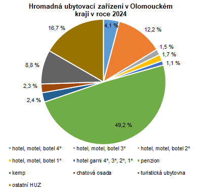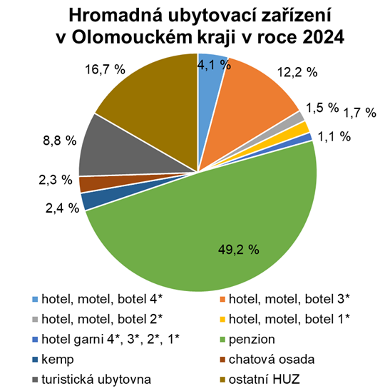 Ve struktuře hromadných ubytovacích zařízení na území Olomouckého kraje mají dominantní postavení penziony, které v roce 2024 představovaly téměř polovinu (49,2 %, 262 subjektů) všech HUZ. Penziony početně převažují i v ostatních krajích ČR s výjimkou hl. m. Prahy. Mezi 110 hotely bylo v kraji nejvíce tříhvězdičkových zařízení (celkem 65, tj. 59,1 % všech hotelů). Hosté taktéž mohli využít služeb 22 čtyřhvězdičkových hotelů, dále 8 dvouhvězdičkových, potom také 9 jednohvězdičkových a 6 hotelů garni. V Olomouckém kraji se nenachází ani jeden hotel, který by disponoval pěti hvězdičkami. Obdobná situace je i v dalších pěti krajích (Ústecký, Liberecký, Královéhradecký, Pardubický a Moravskoslezský).